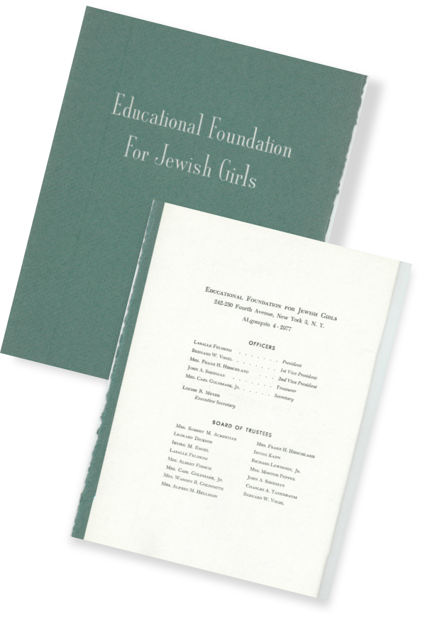 While the Hebrew Technical School for Girls had been innovative and successful, a new network of vocational public schools created by New York City emerged as better equipped to adapt to changing industrial developments. In 1932, Hebrew Tech closed its doors, eventually selling the building to the Board of Education. Two years later, as Hebrew Tech’s board considered its options, its members chose to use the funds acquired from the sale to launch a foundation which would provide scholarships and financial assistance to talented women in need. In 1939, the Educational Foundation for Jewish Girls was officially formed to help Jewish women enter and succeed in education.